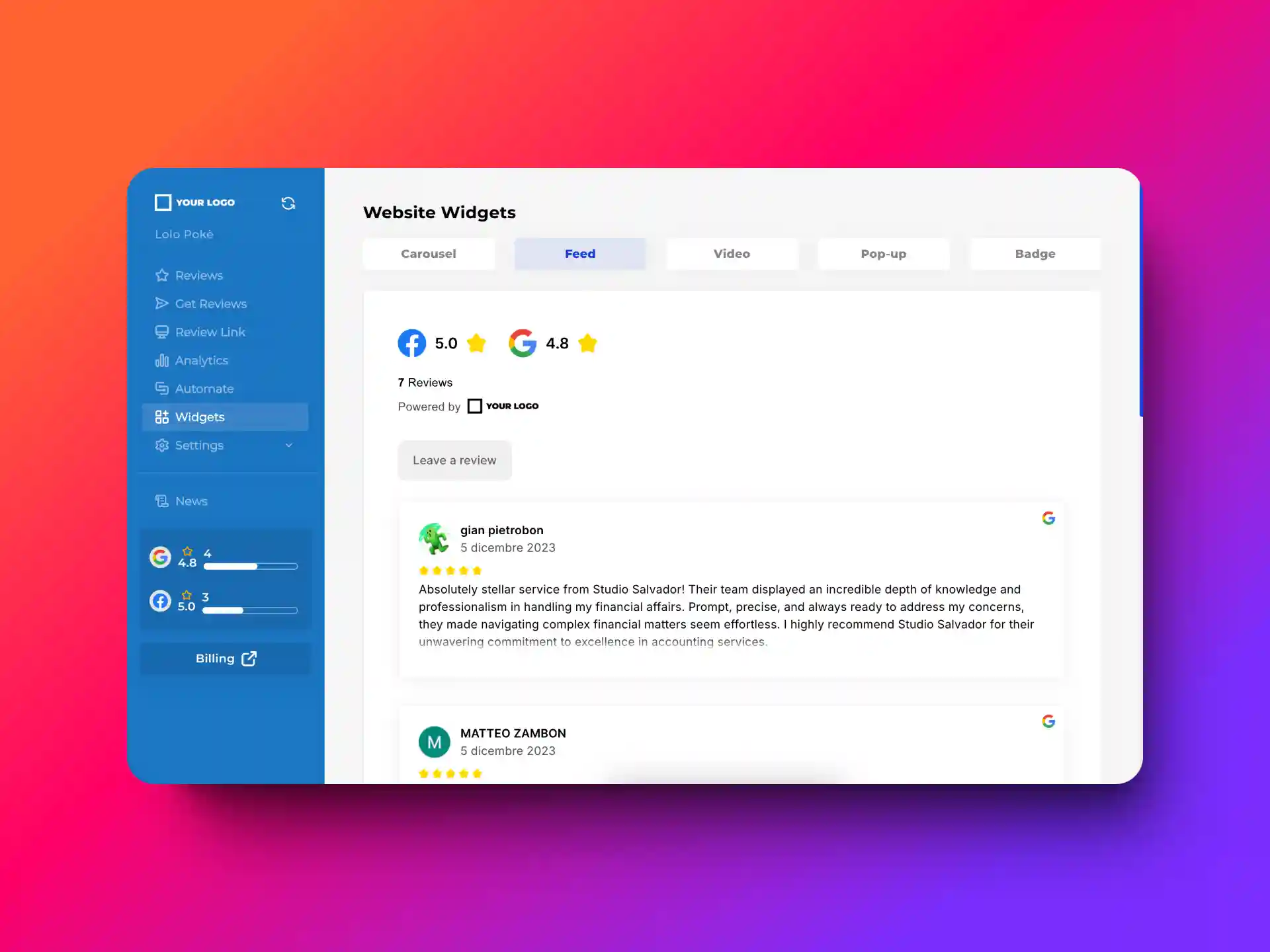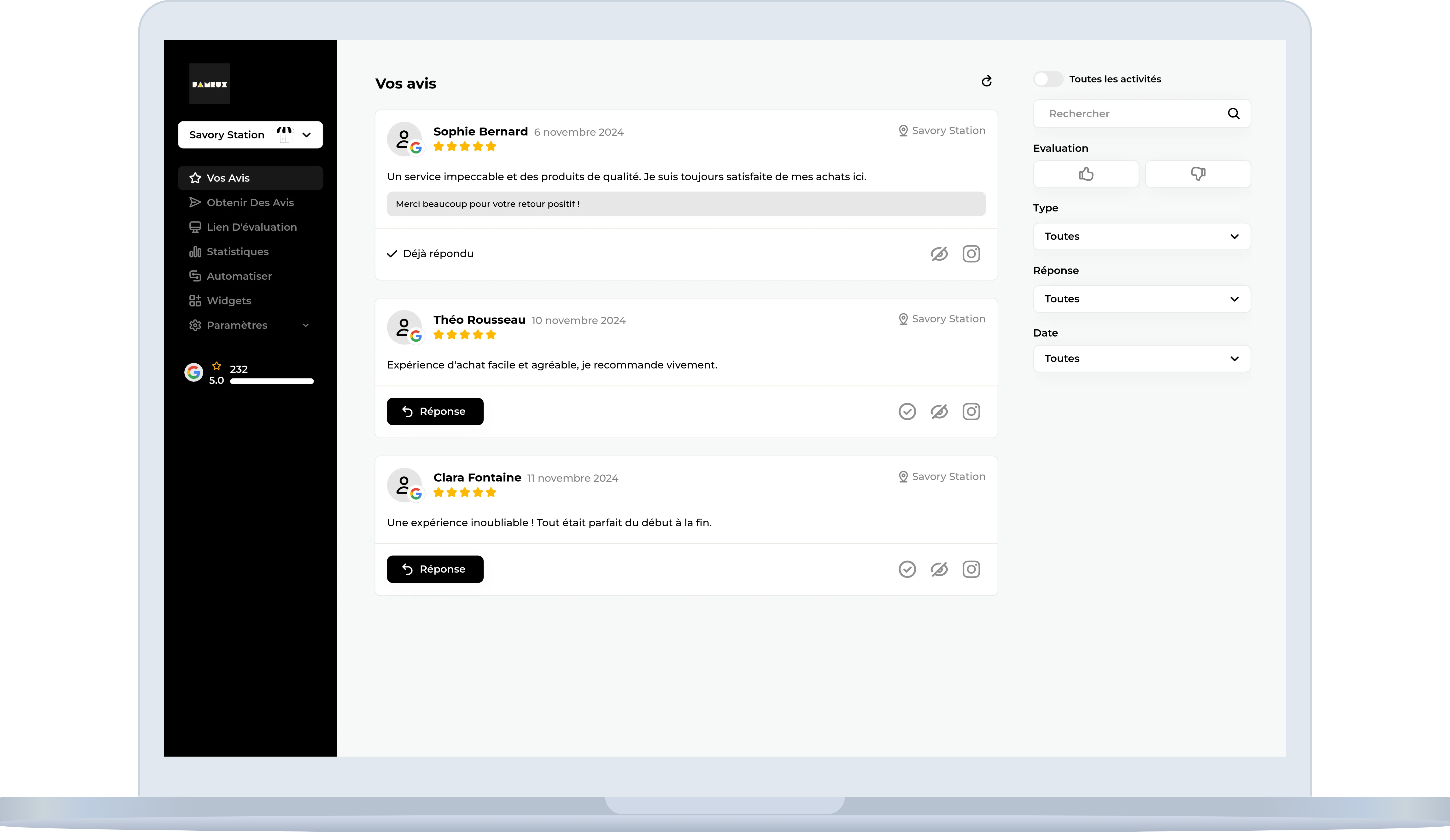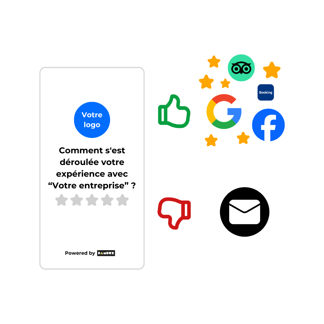 Nos automations envoient des demandes d’avis personnalisées par SMS, WhatsApp ou e-mail.